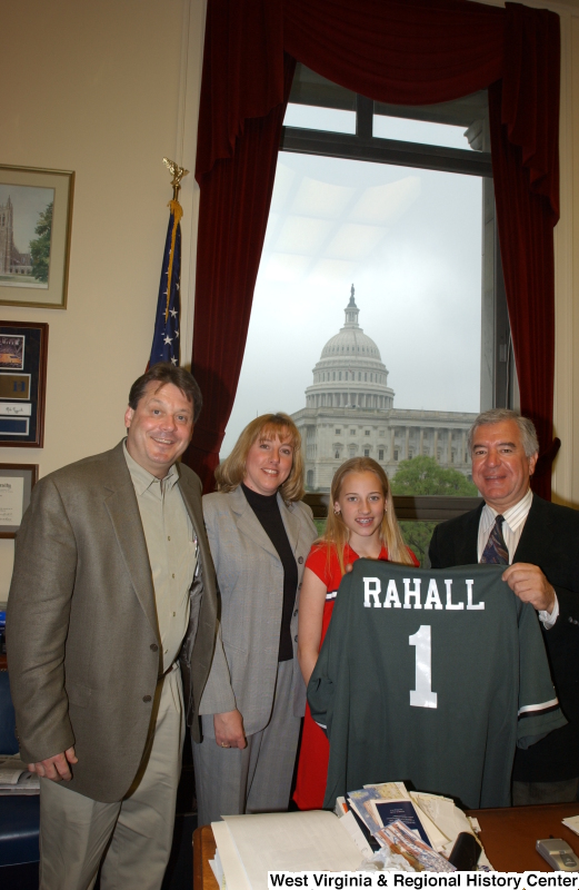 - Congressman Rahall holds a "RAHALL" sports jersey and stands with a man, woman, and girl in his Washington office.