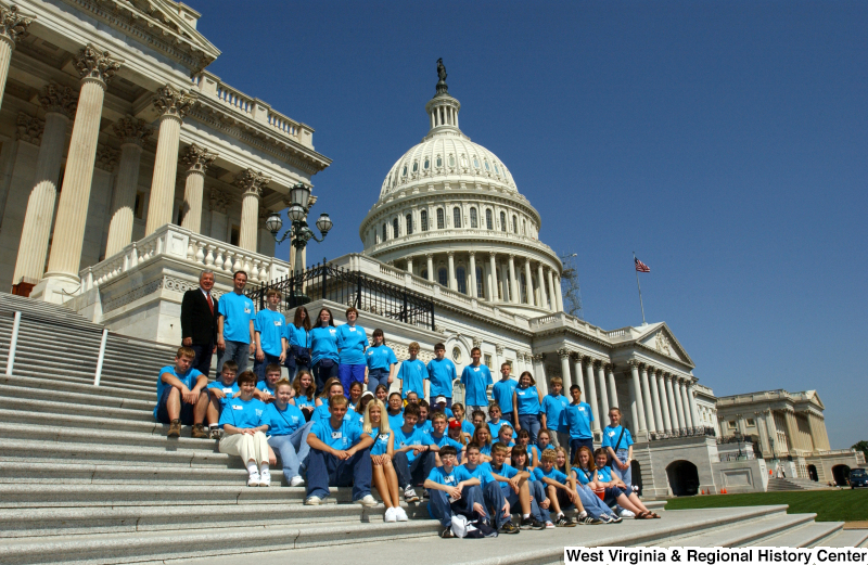 - Photograph of Congressman Rahall with children in blue shirts on the steps of the Capitol Building