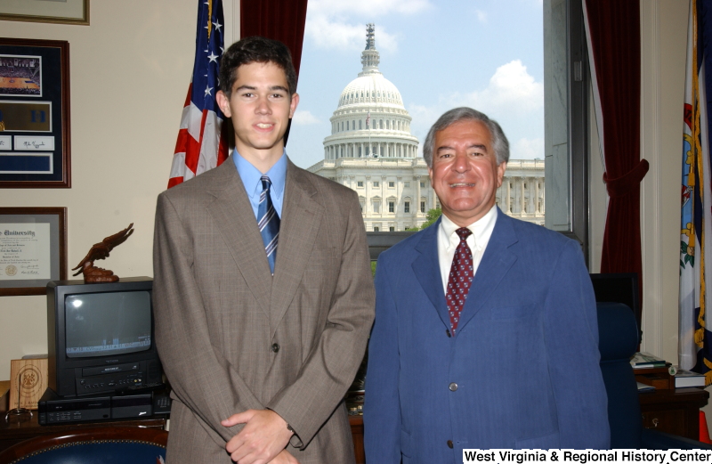 - Congressman Rahall stands with a man wearing a taupe suit in his Washington office.