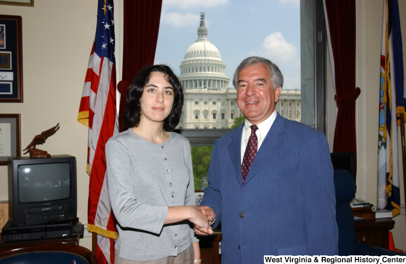 - Congressman Rahall stands with a woman wearing a grey shirt in his Washington office.