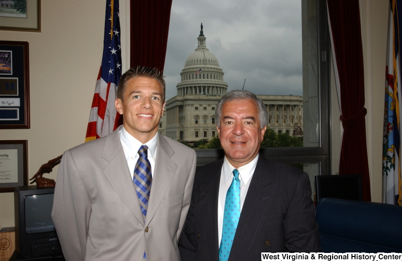 - Congressman Rahall stands with a man wearing a grey suit in his Washington office.