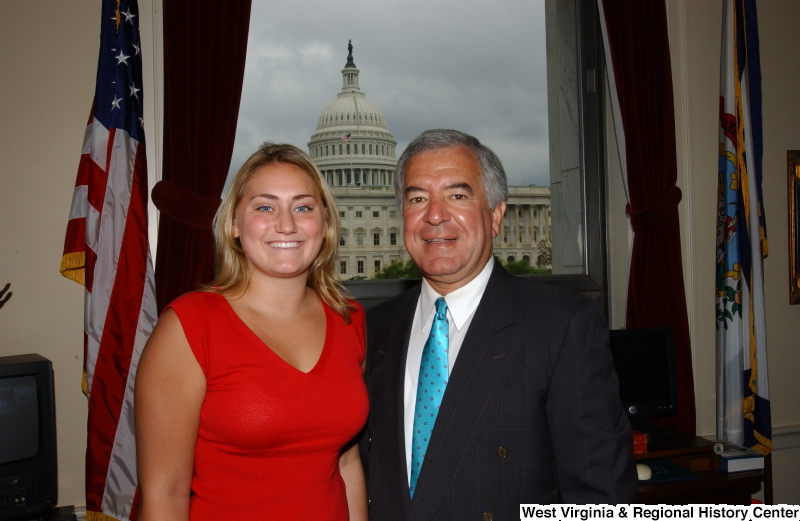 - Congressman Rahall stands with a woman wearing a red shirt in his Washington office.