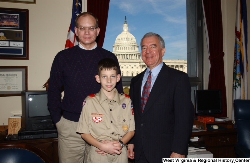 - Congressman Rahall stands in his Washington office with a man and a Boy Scout.
