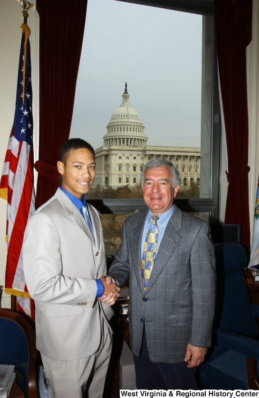 - Congressman Rahall stands in his Washington office with a man wearing a light grey suit.