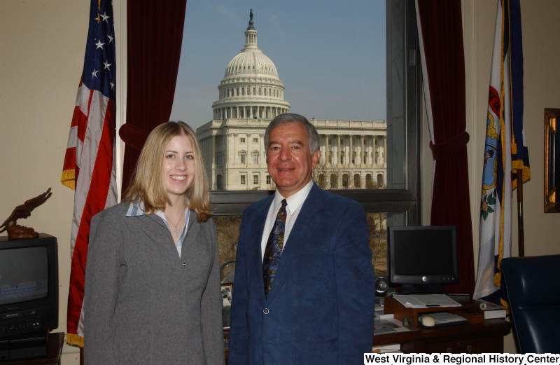 - Congressman Rahall stands in his Washington office with a woman wearing a grey jacket.