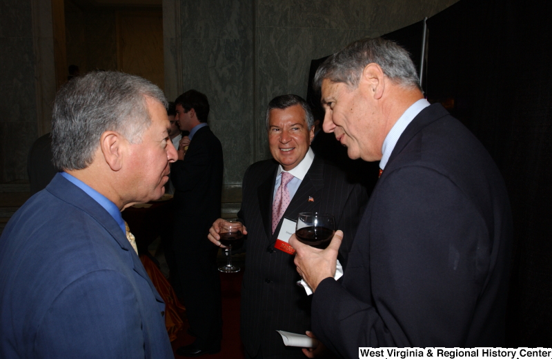 - Congressman Rahall stands with two men holding wine glasses.