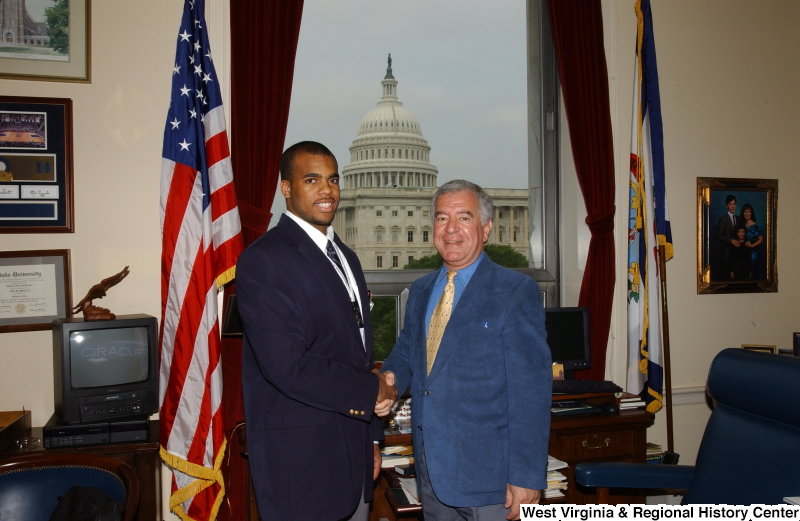 - Congressman Rahall stands in his Washington office with a man wearing a dark blue blazer.