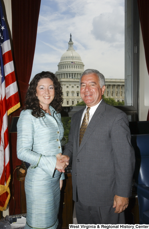 - Congressman Rahall stands in his Washington office with a woman wearing an aqua dress.