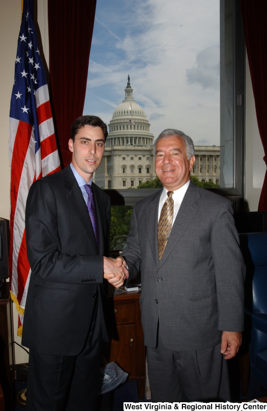 - Congressman Rahall stands in his Washington office with a man wearing a black suit and purple tie.