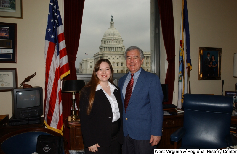 - Congressman Rahall stands in his Washington office with a woman wearing a white striped blouse and black jacket.