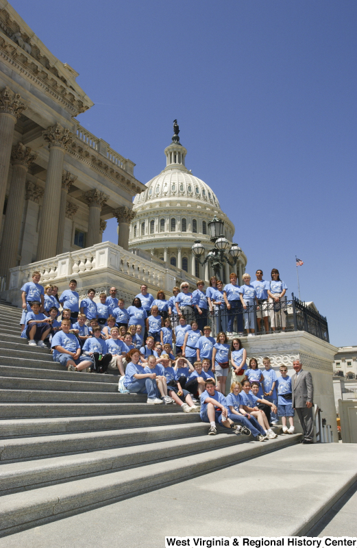 Photograph of Congressman Rahall on the steps of the Capitol Building with children and adults wearing blue shirts containing an image of West Virginia