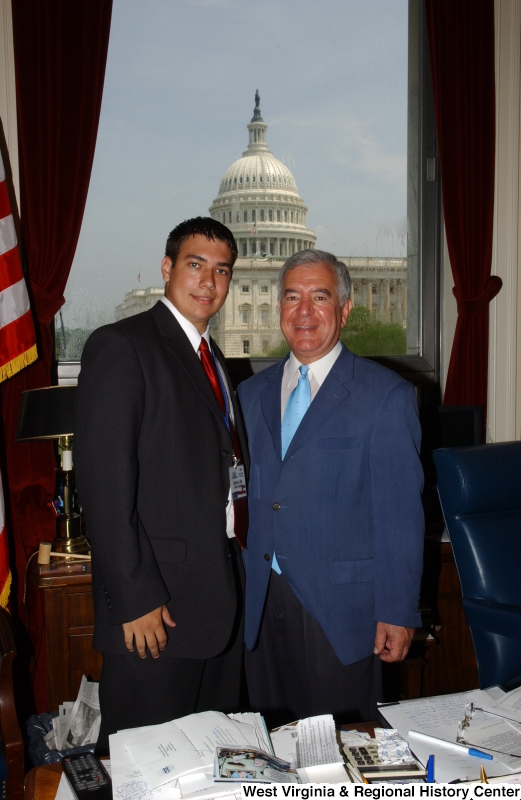 - Congressman Rahall stands in his Washington office with a man wearing a dark suit, red tie, and Presidential Classroom badge.