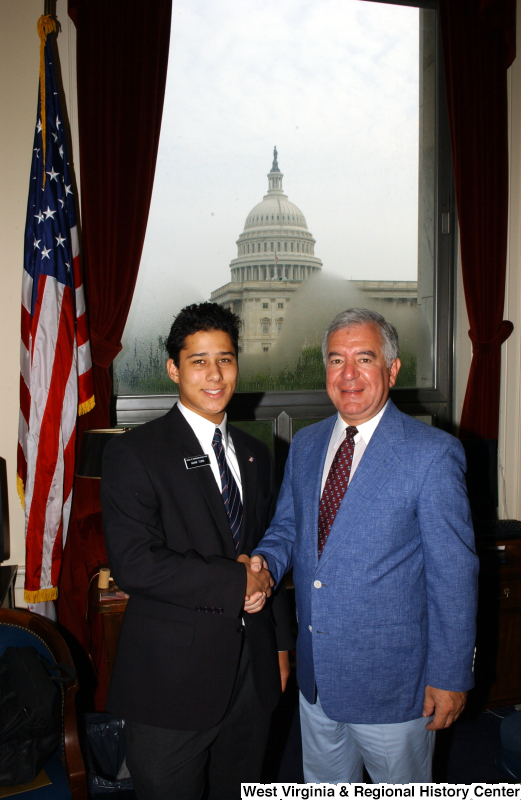 Photograph of Congressman Rahall in his Washington office standing with a man wearing a name badge indicating the first name Adam