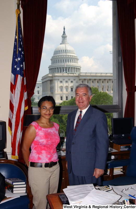 - Congressman Rahall stands in his Washington office with a woman wearing a pink shirt.