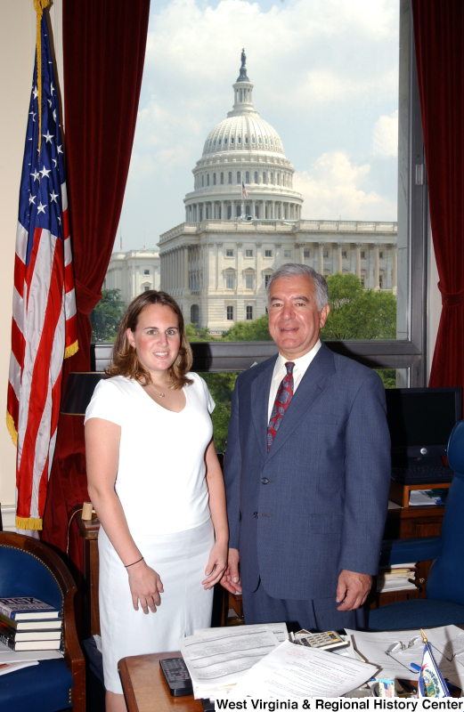 - Congressman Rahall stands in his Washington office with a woman wearing a white shirt.