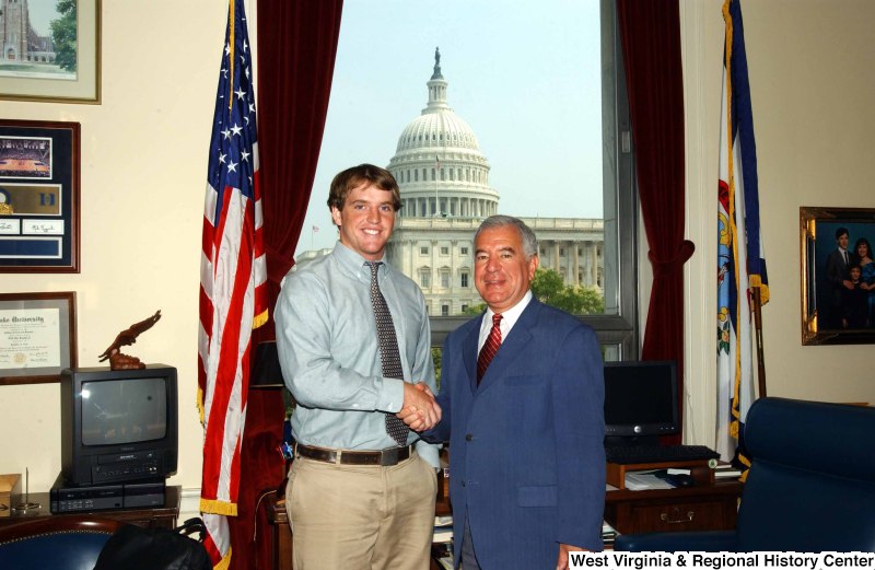 - Congressman Rahall stands in his Washington office with a man wearing a blue-tinged shirt and khaki pants.