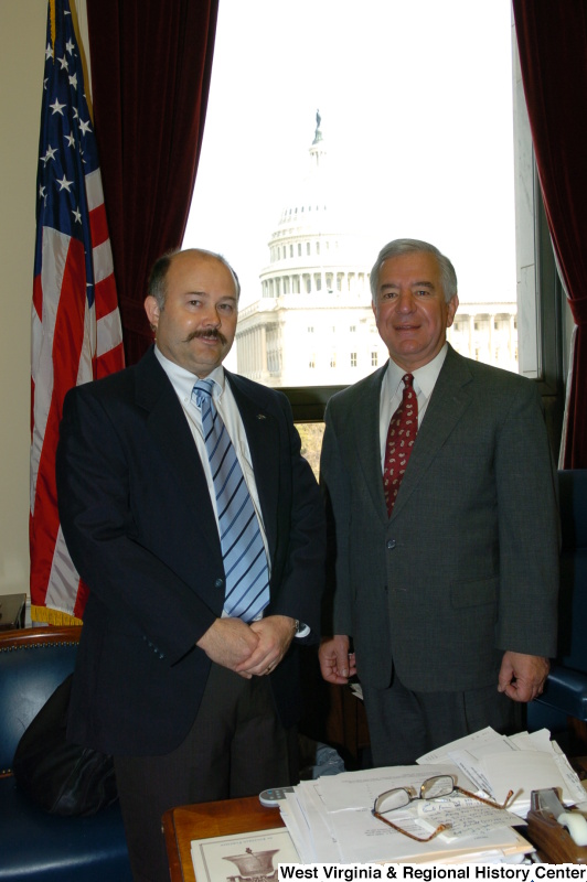 - Congressman Rahall stands in his Washington office with a man wearing a blue striped tie.