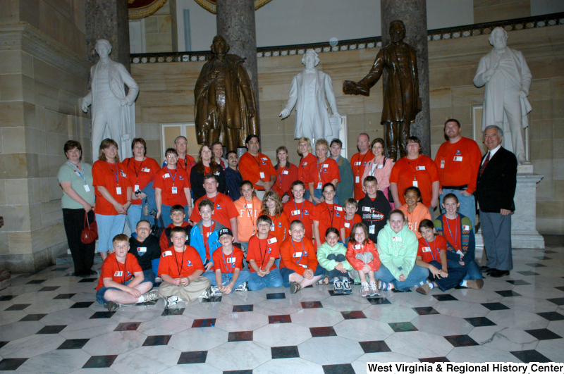 - Photograph of Congressman Rahall standing with a group of children and adults, most of whom are wearing orange shirts, and statues