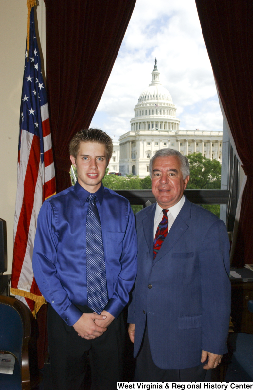 - Congressman Rahall stands in his Washington office with a young man wearing a blue shirt.