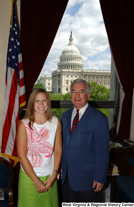 - Congressman Rahall stands in his Washington office with a woman wearing a floral-print shirt and green skirt.