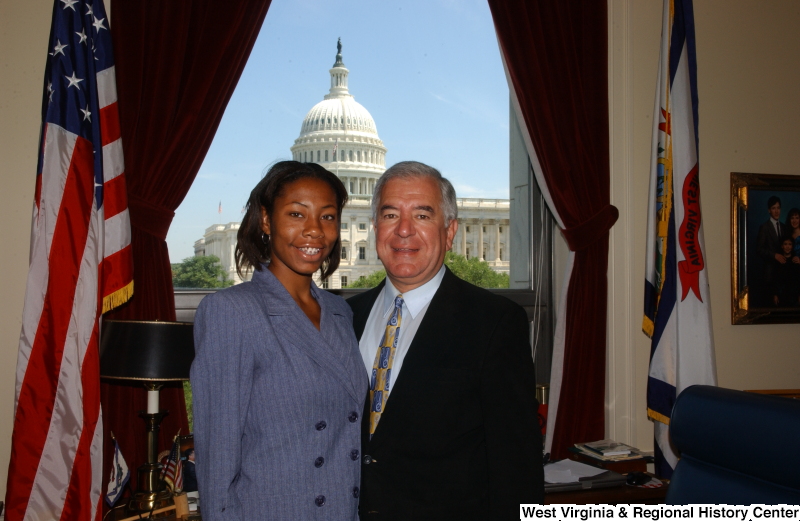 - Photograph of Congressman Rahall in his Washington office standing with a woman wearing a lavender-tinged suit