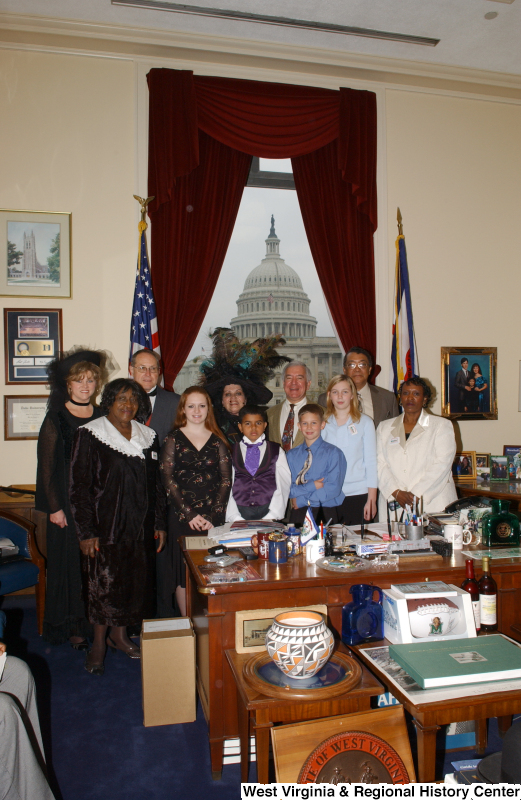 - Photograph of Congressman Rahall in his Washington office standing with a group of children and adults, including a woman with a plumed hat