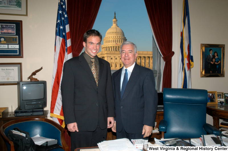 - Congressman Rahall stands in his Washington office with a man wearing a dark suit and multicolored tie.