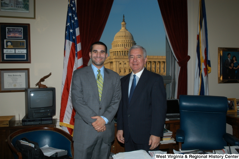 - Congressman Rahall stands in his Washington office with a man wearing a grey suit, blue shirt, and green striped tie.
