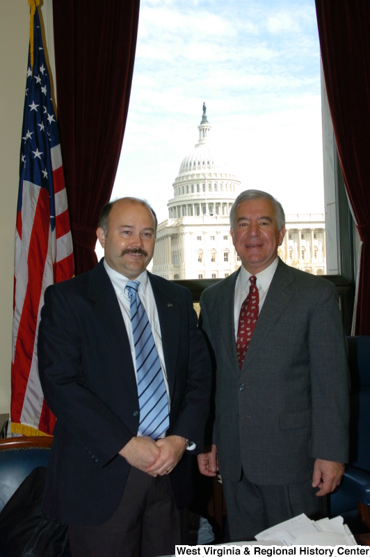 - Congressman Rahall stands in his Washington office with a man wearing a dark blazer and blue striped tie.