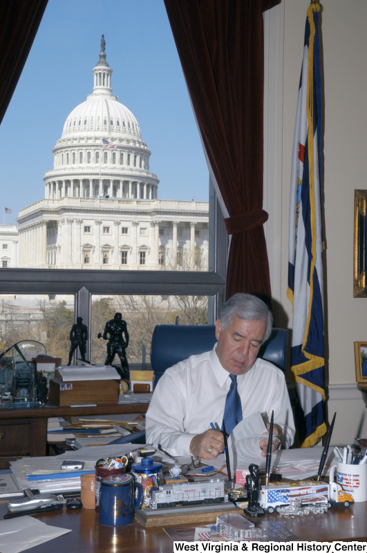 - Photograph of Congressman Rahall sitting at his desk in his Washington office (Member portrait)