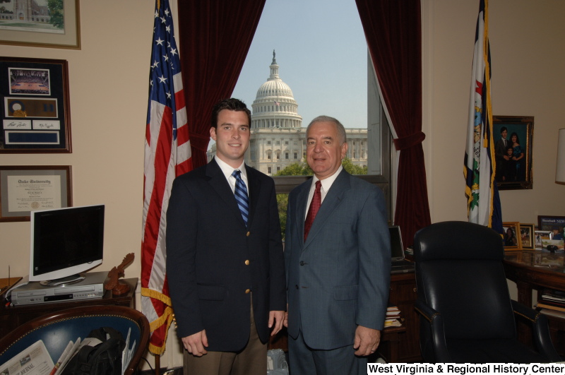 - Congressman Rahall stands in his Washington office with a man wearing a dark blazer and blue striped tie.