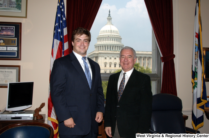 Photograph of Congressman Rahall in his Washington office standing with a man wearing a dark pinstripe suit and blue tie