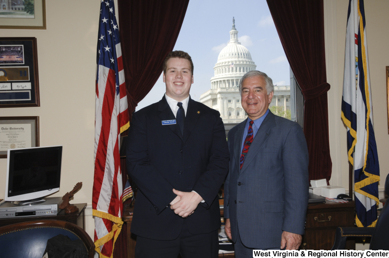 Photograph of Congressman Rahall in his Washington office standing with Senate Republican Page Cameron Wilson
