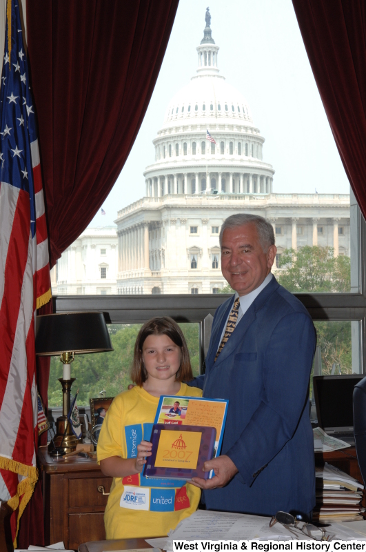 - Photograph of Congressman Rahall standing in his Washington office with girl holding materials labeled 2007 Children's Congress and wearing a shirt with the logo for Juvenile Diabetes Research Foundation International