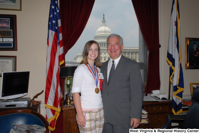 Photograph of Congressman Rahall standing in his Washington office with Scott High School student Sarah Dolan, who wears a medal and "scholar" ribbon