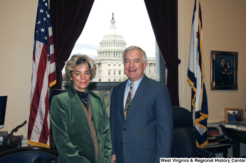 - Congressman Rahall stands in his Washington office with a woman wearing a green jacket.