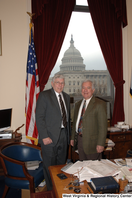 - Photograph of Congressman Rahall standing in his Washington office with a man wearing a grey pinstripe suit and square-patterned tie
