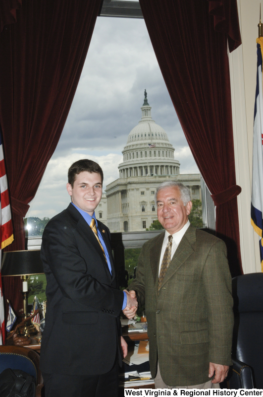 - Photograph of Congressman Rahall in his Washington office shaking hands with a man wearing a dark suit and light blue shirt