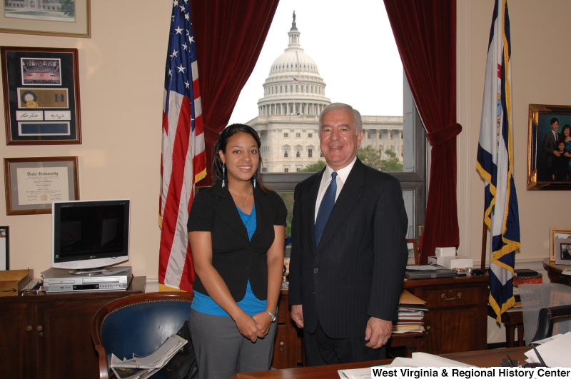 - Congressman Rahall stands in his Washington office with a woman wearing a blue shirt and black short-sleeved jacket.