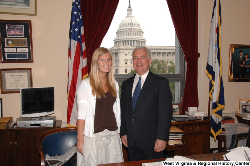 - Congressman Rahall stands in his Washington office with a woman wearing a brown shirt and white sweater.