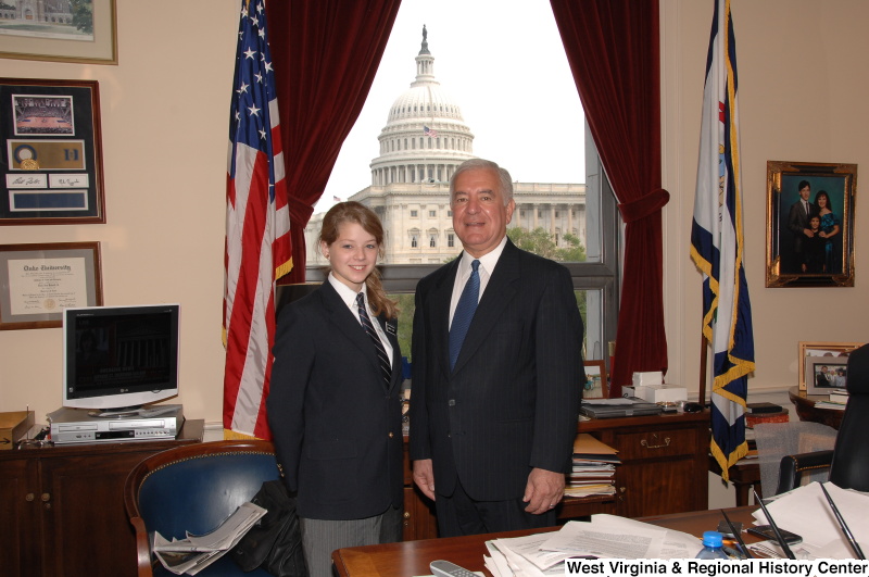 Photograph of Congressman Rahall standing in his Washington office with a young woman wearing a black blazer and striped tie