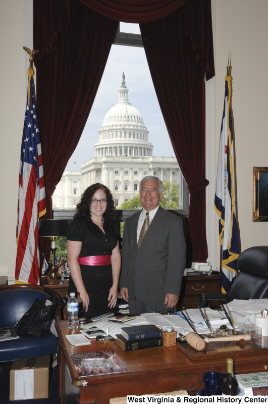 - Photograph of Congressman Rahall standing in his Washington office with a woman wearing black clothing and a red sash