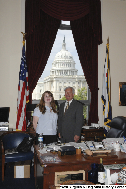 - Photograph of Congressman Rahall standing in his Washington office with a woman wearing a blue-tinged blouse