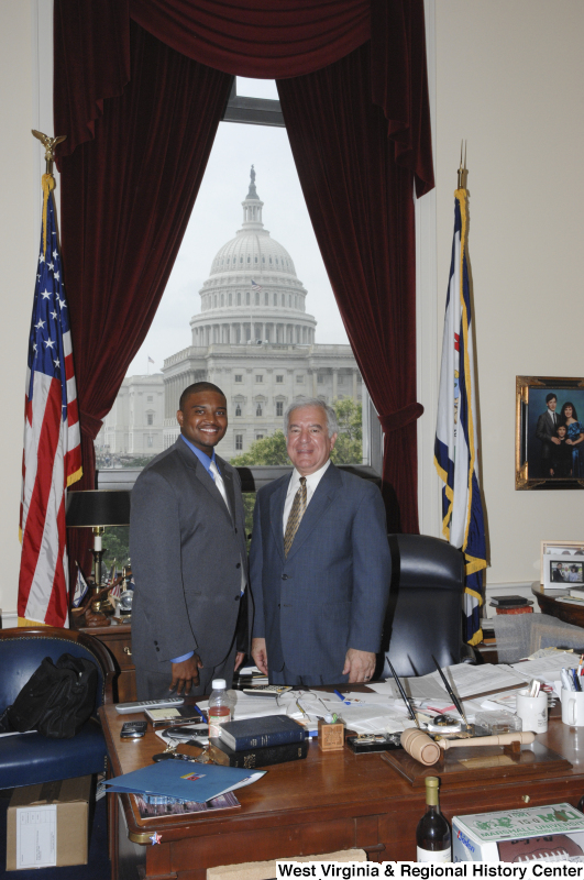 - Congressman Rahall stands in his Washington office with a man wearing a grey suit, blue shirt, and light tie.