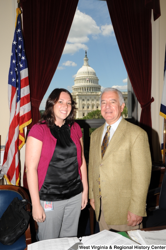 - Congressman Rahall stands in his Washington office with a woman wearing a black shirt and magenta sweater.