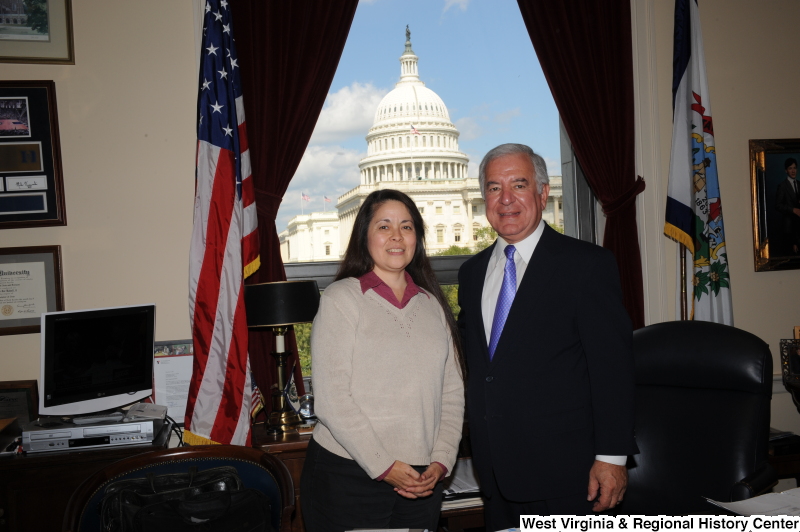 - Photograph of Congressman Rahall standing in his Washington office with a woman wearing a beige sweater and magenta shirt