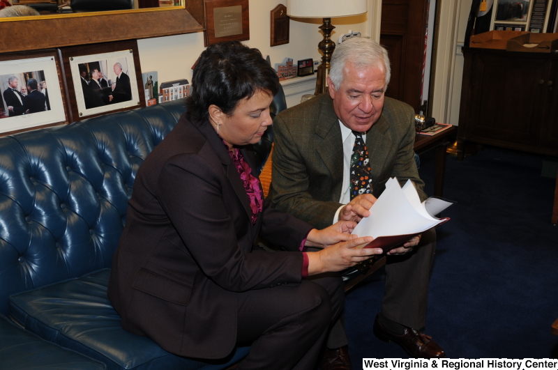 - Congressman Rahall wears a Halloween-themed tie and looks at documents with a woman wearing a black suit.