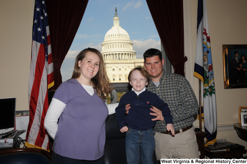 - A man, woman, and boy stand in Congressman Rahall's Washington office.