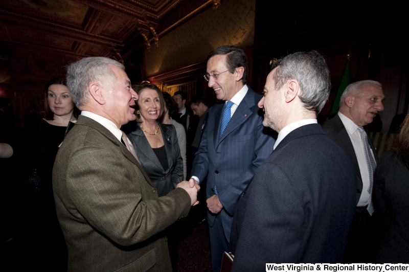 - Congressman Rahall shakes hands with a foreign dignitary, accompanied by Nancy Pelosi and others.