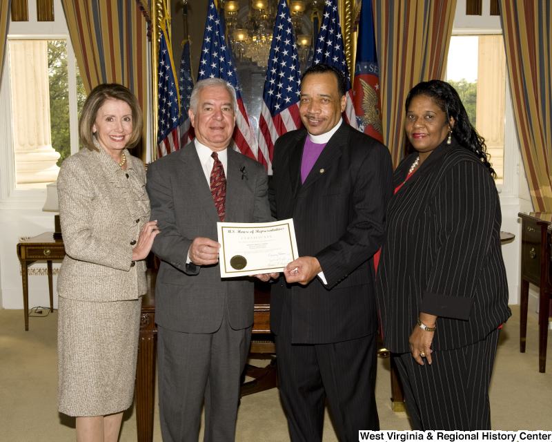 - Photograph of Congressman Rahall and Nancy Pelosi presenting a certificate to Bishop Fred T. Simms, Heart of God Ministries, Beckley, West Virginia, accompanied by another woman